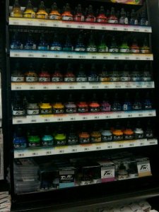 So back I went. Which proved to be dangerous as I had to pass an extensive collection of graphic pens, of which I have more than is considered natural or healthy. I won’t comment on whether I took any home or not that day. Irrelevant. I grabbed a few more bottles of ink, threw on my mental blinders, my resolve unfaltering, ignoring the beckoning canvases, the seductive shellacs, the ridiculously unnecessary sketchbooks, and resumed my place in line, willing it to move quickly to remove me from temptation.
